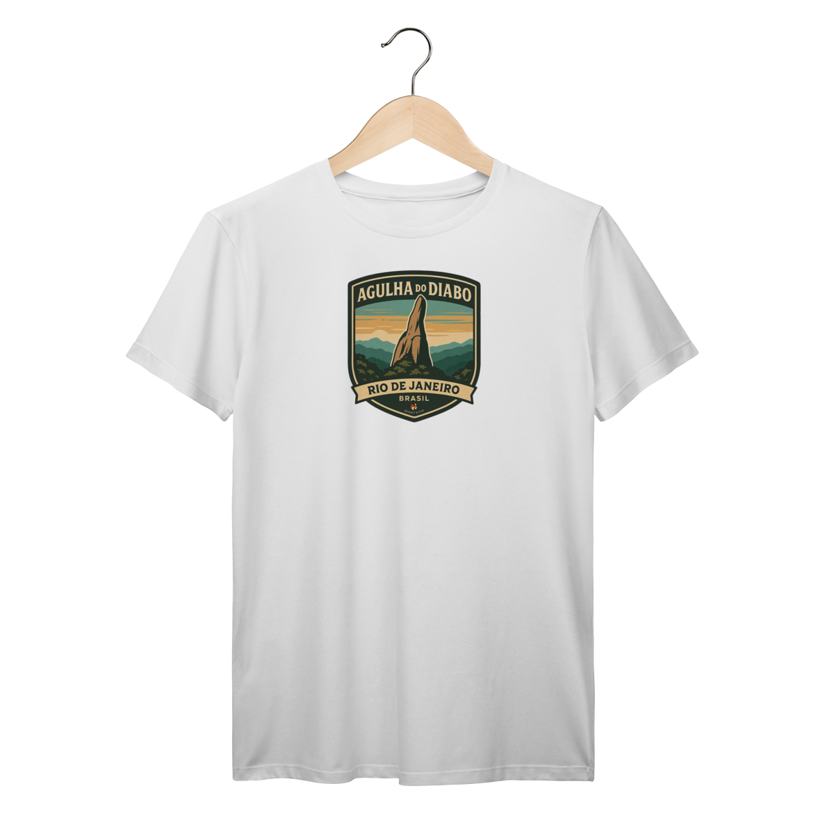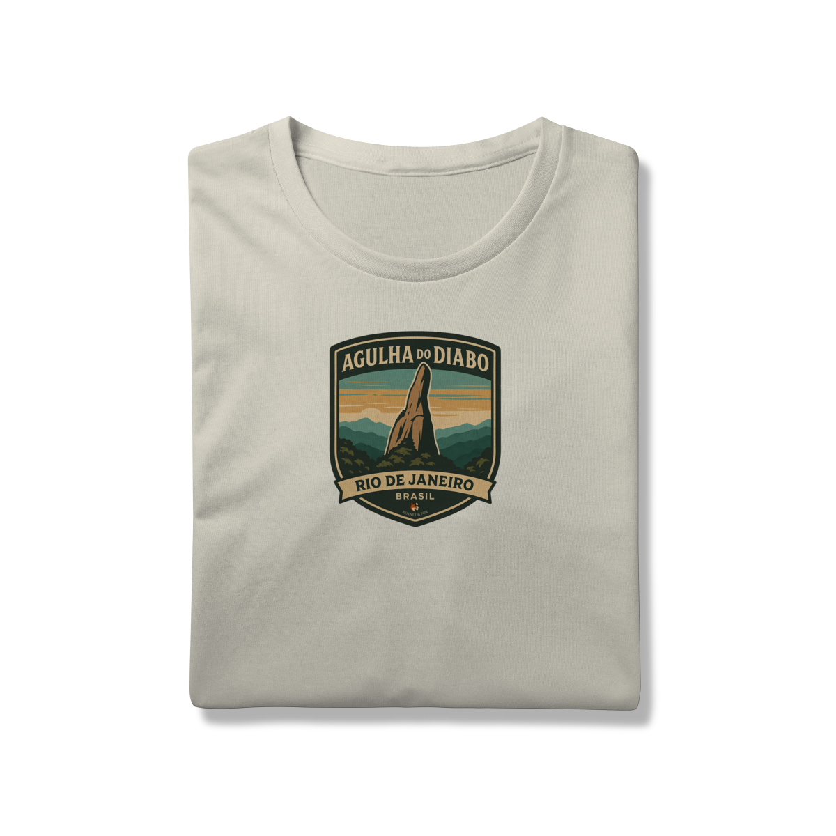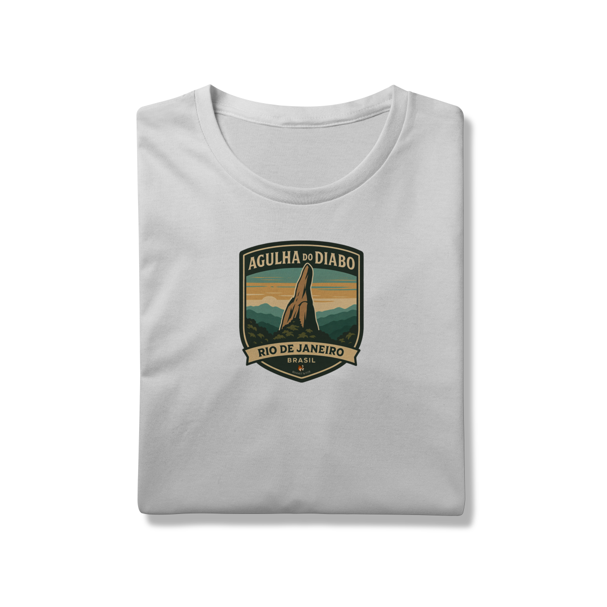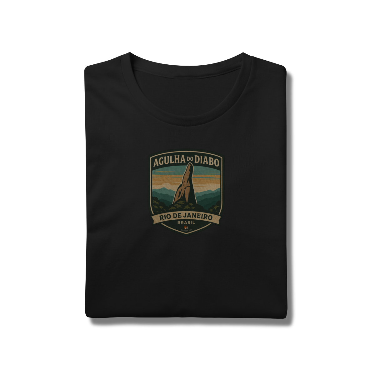 • Design Icônico: Uma estampa que retrata a silhueta singular e imponente da Agulha do Diabo, um verdadeiro troféu para os montanhistas.