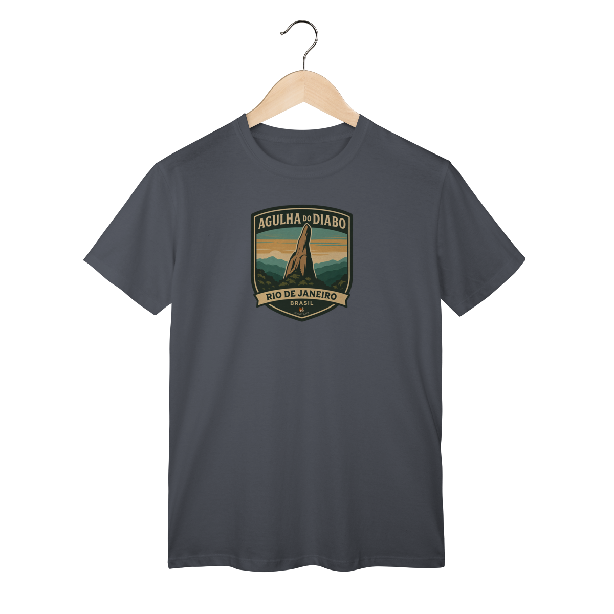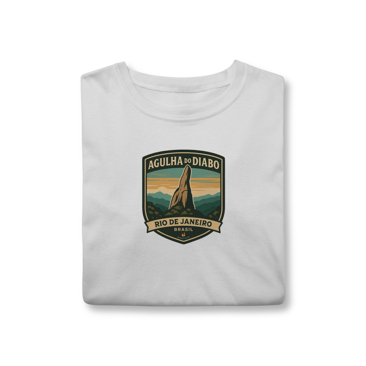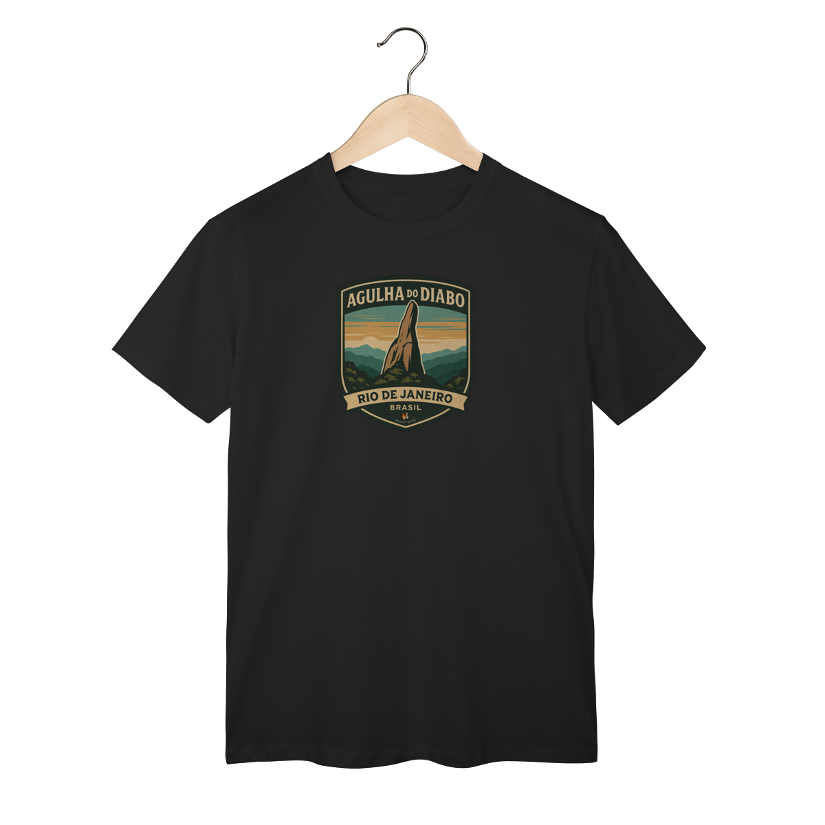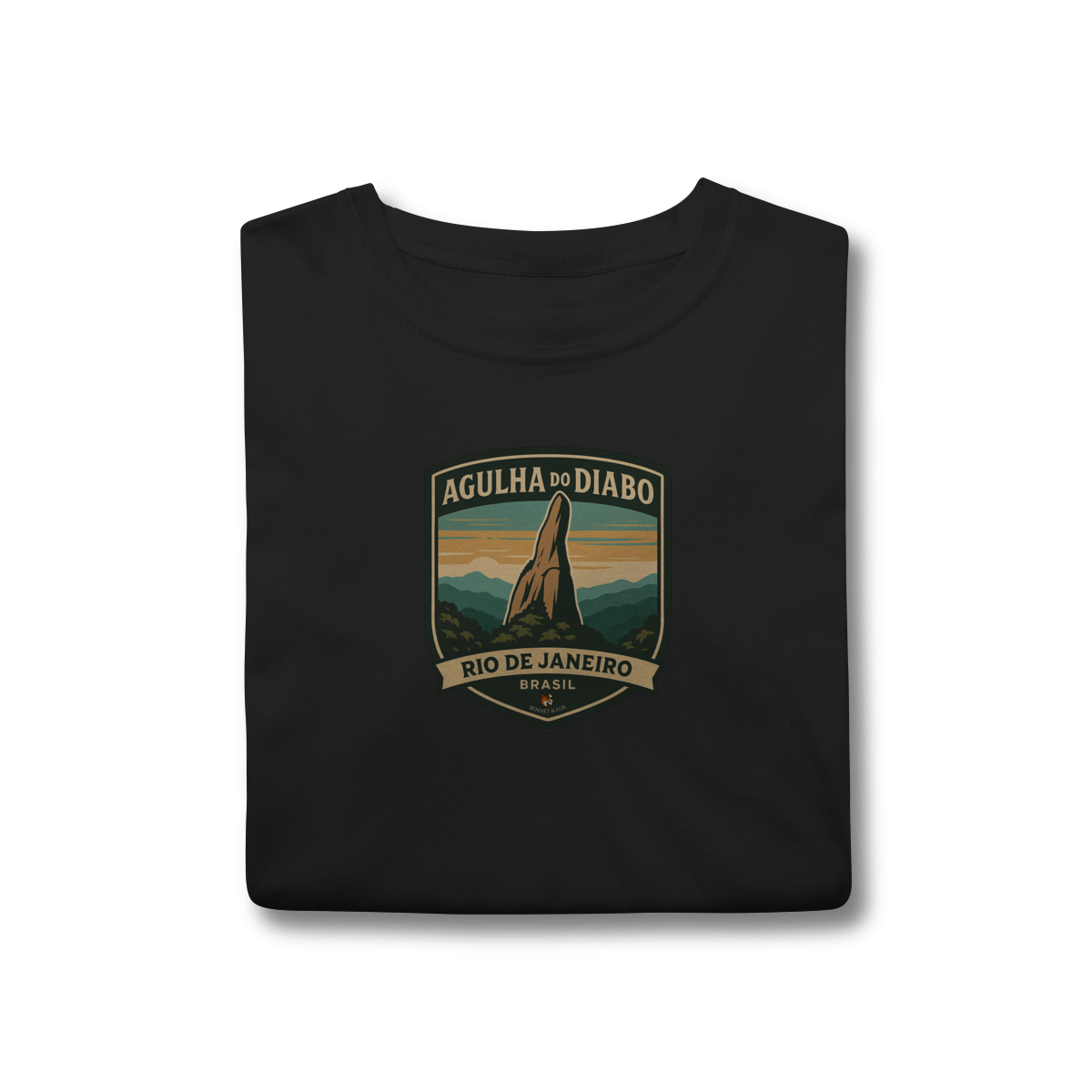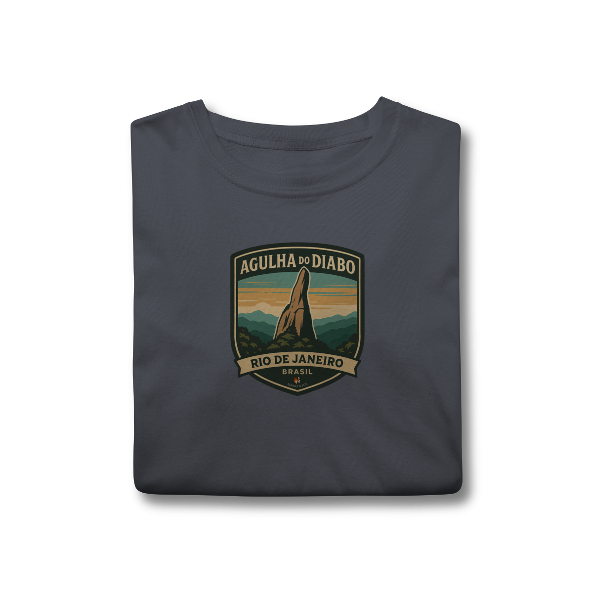 • Design Icônico: Uma estampa que retrata a silhueta singular e imponente da Agulha do Diabo, um verdadeiro troféu para os montanhistas.