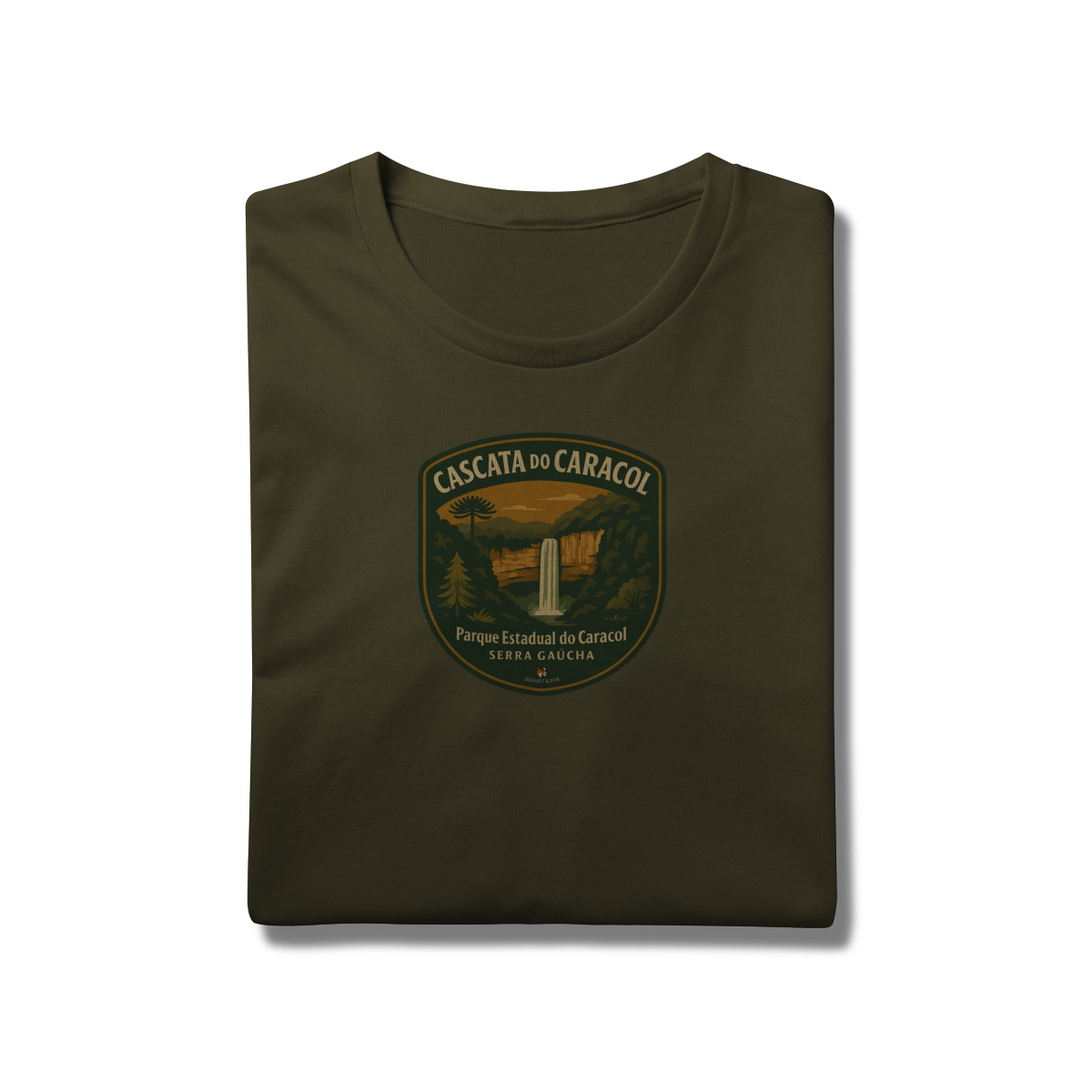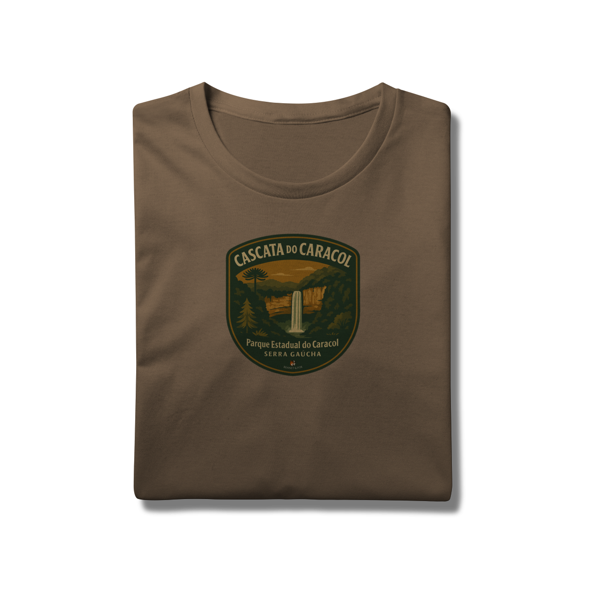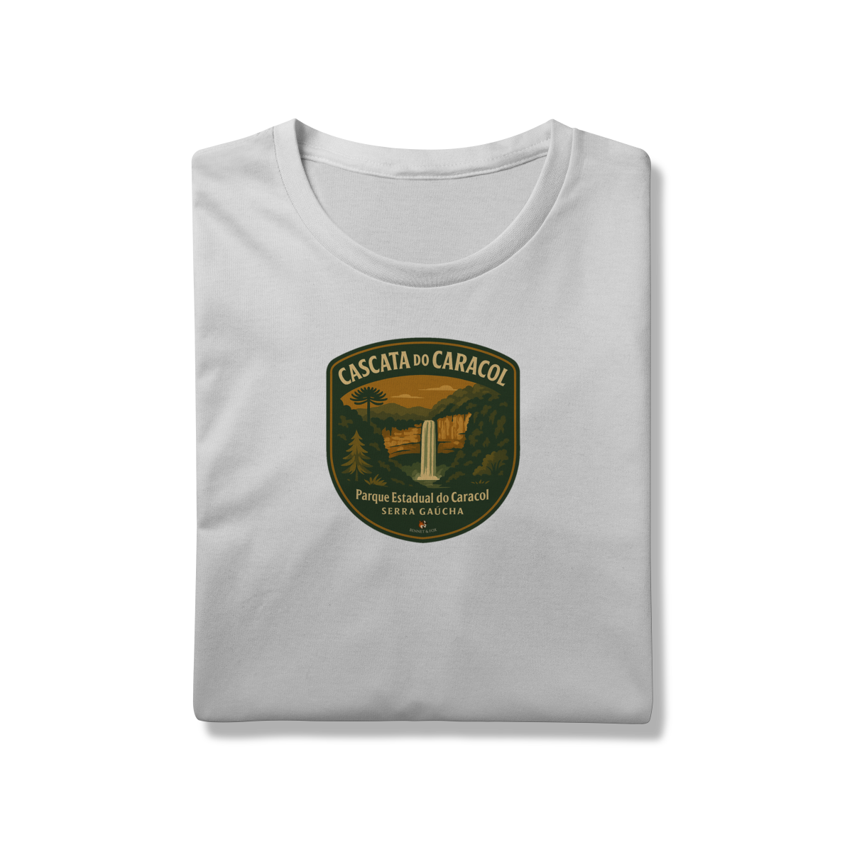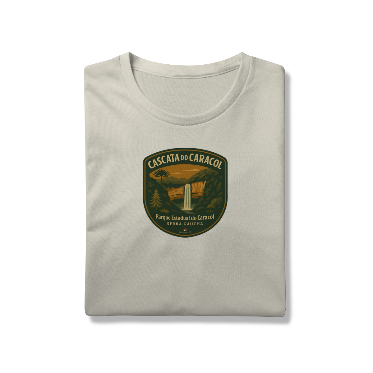 A Cascata do Caracol é a força da natureza em exibição. É o som constante da água, a névoa que sobe do vale e a vista vertiginosa do observatório. Nossa estampa foi criada para capturar essa emoção: a queda d'água de 131 metros, a moldura de araucárias e a sensação de estar diante de um verdadeiro monumento natural. É uma peça que veste a sua admiração.