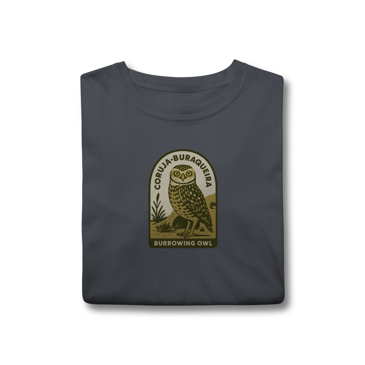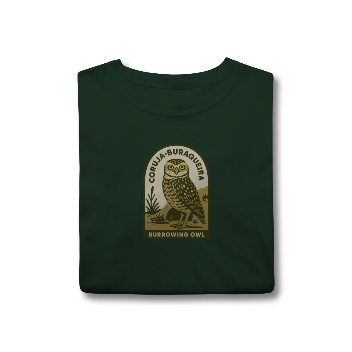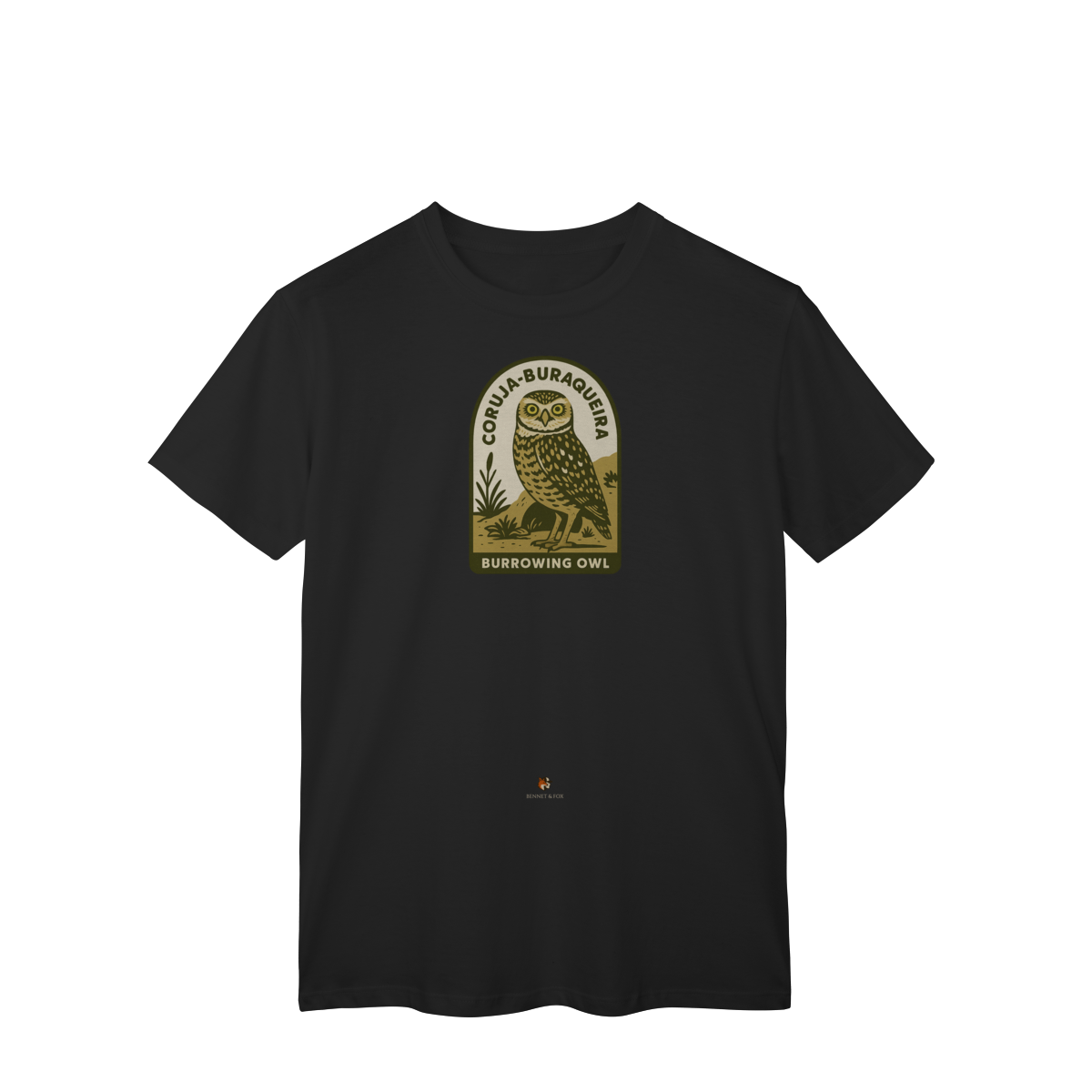 • Design Autêntico: Uma estampa que retrata a Coruja-Buraqueira com seu olhar expressivo e porte único, em um autêntico estilo vintage.