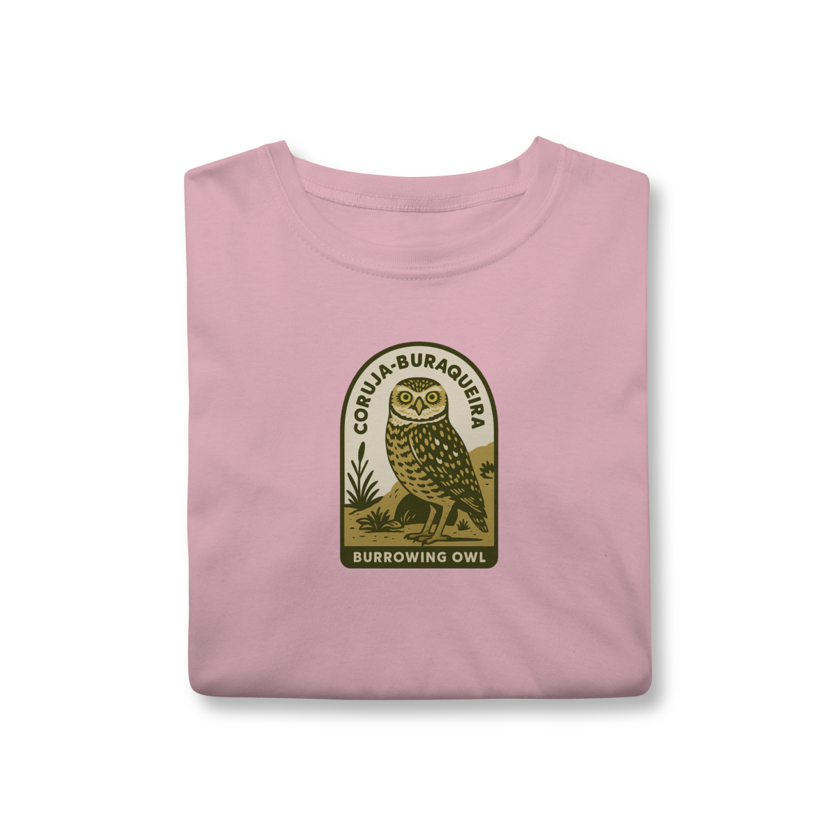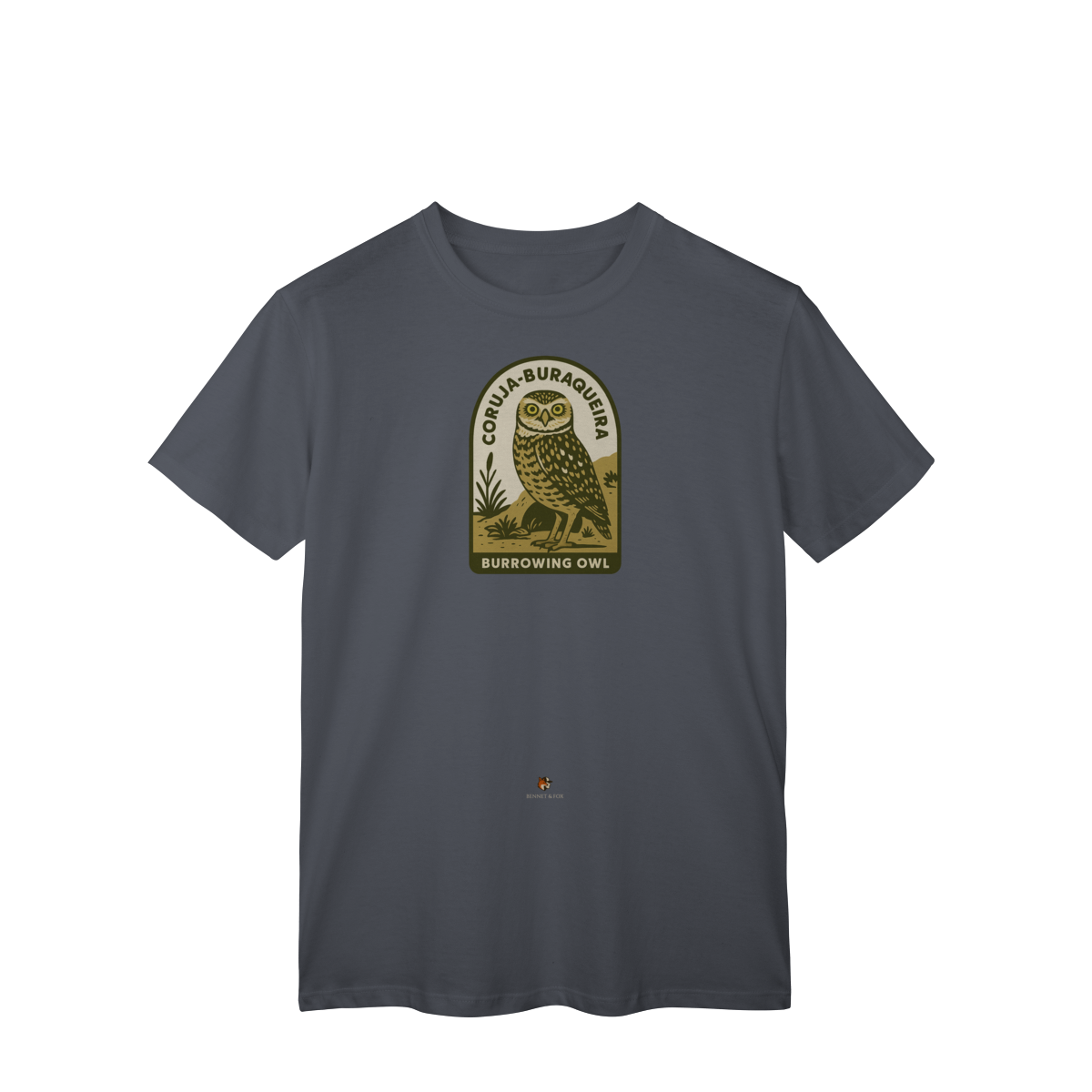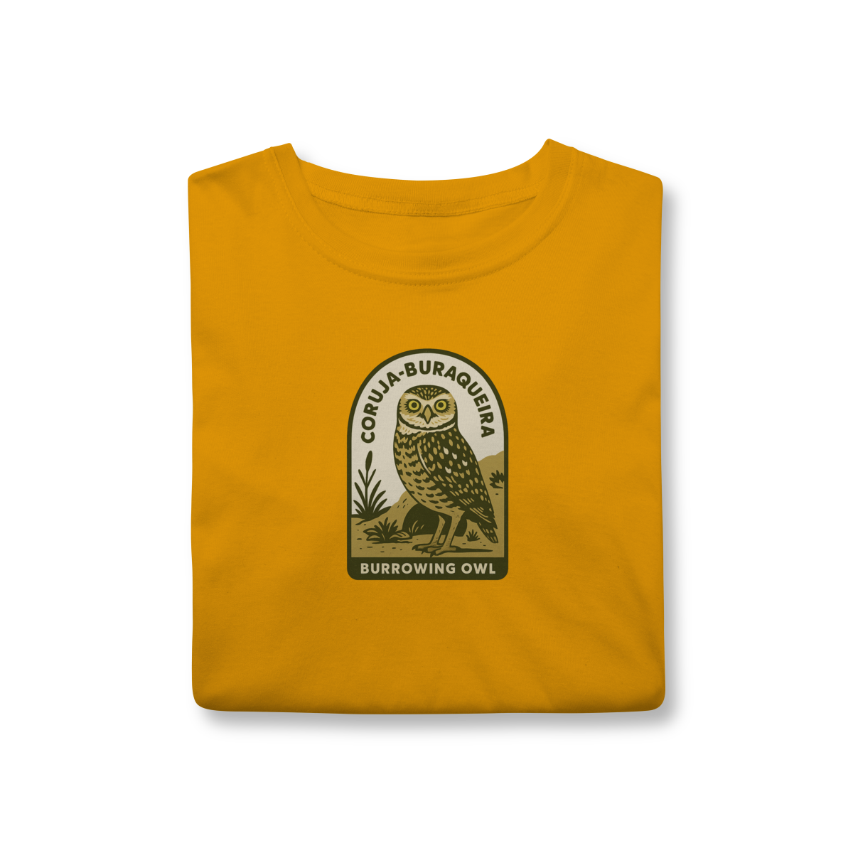 • Design Autêntico: Uma estampa que retrata a Coruja-Buraqueira com seu olhar expressivo e porte único, em um autêntico estilo vintage.