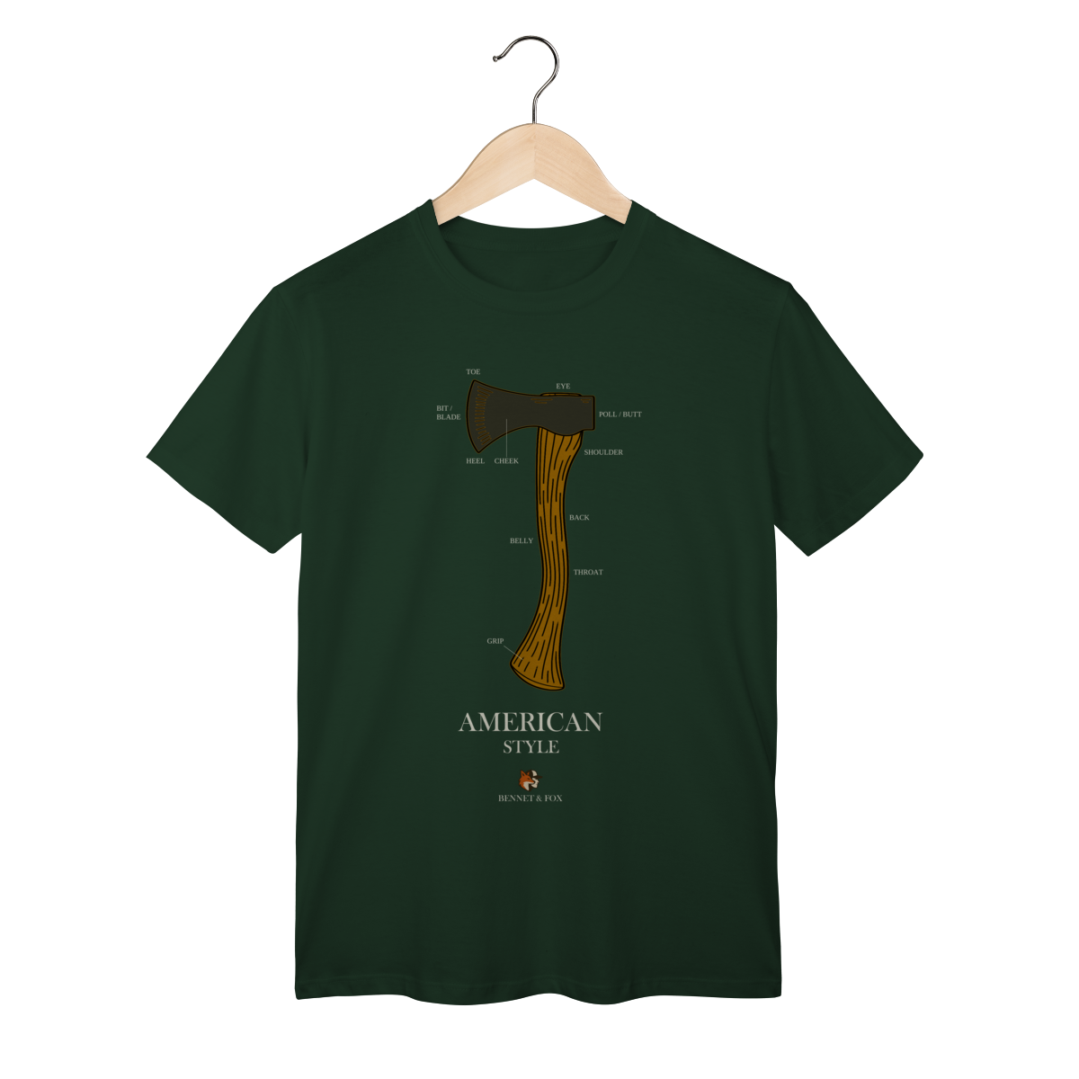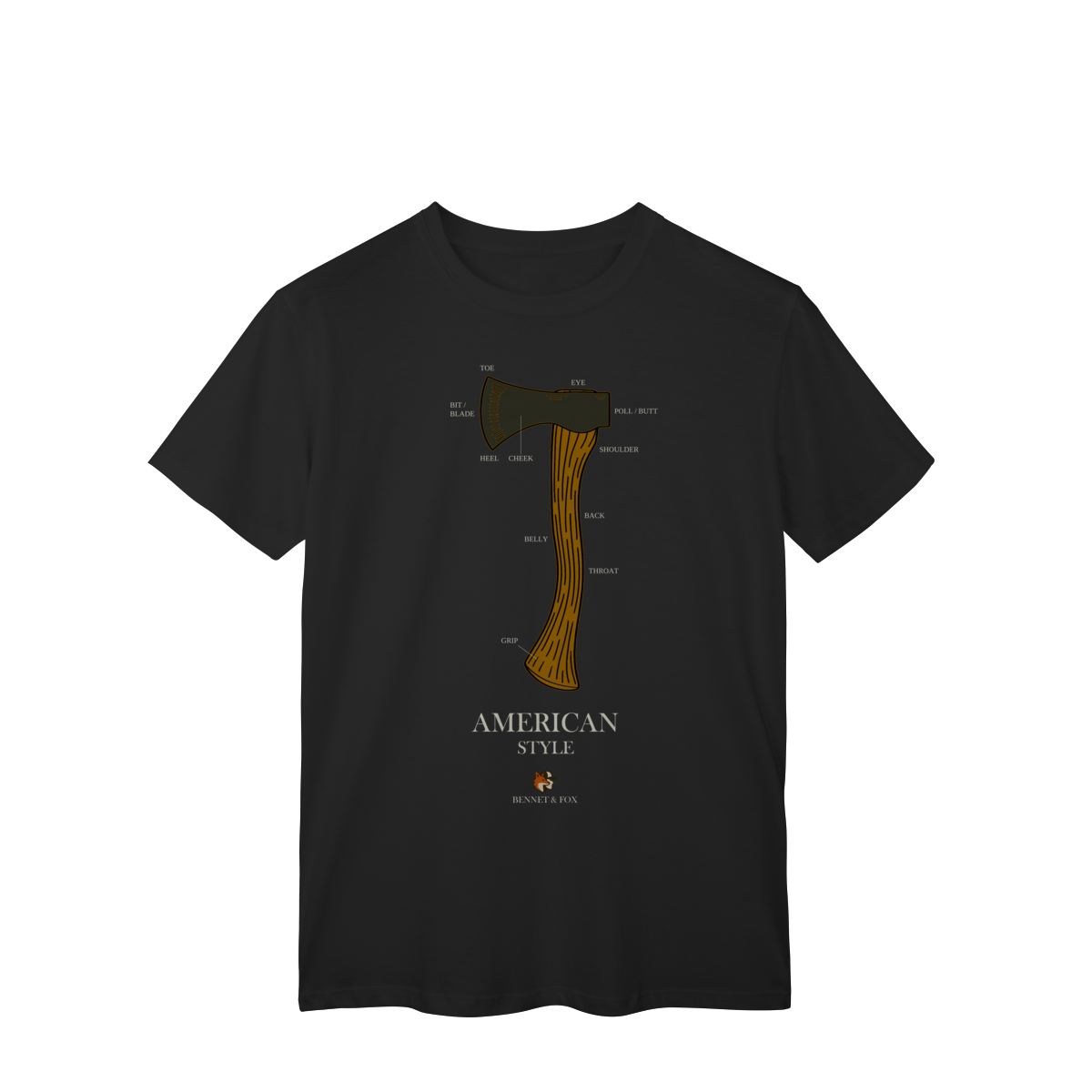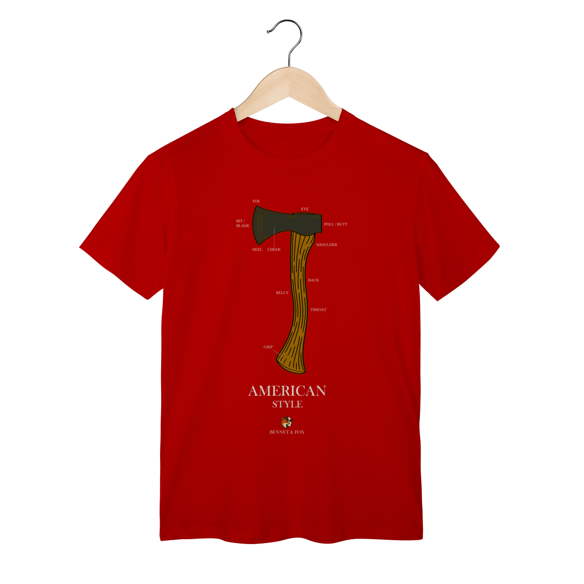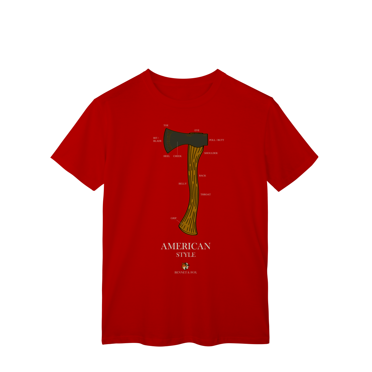 • Design Robusto: Uma estampa de inspiração vintage que celebra o machado americano, com cores duráveis e um visual que transmite força e tradição.
