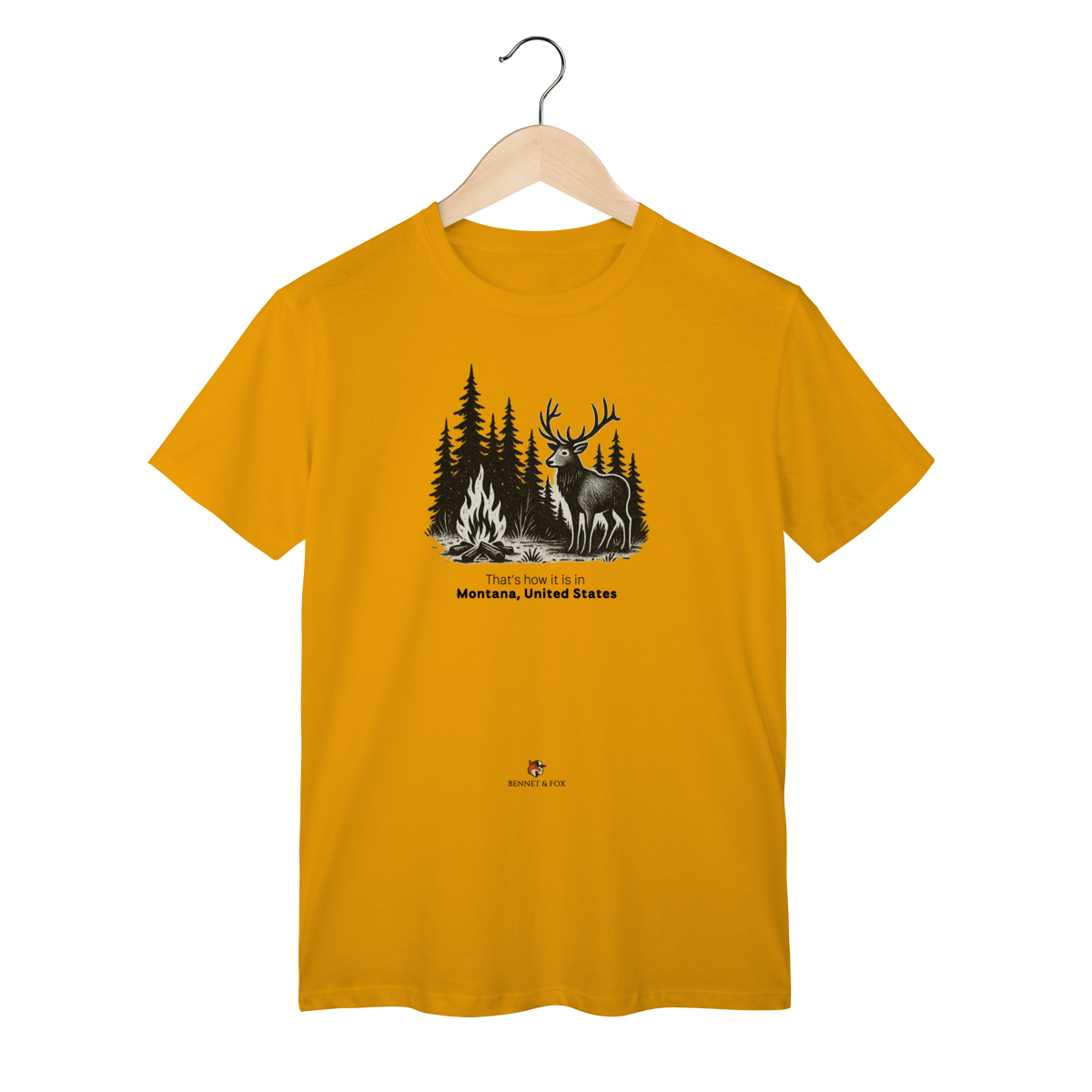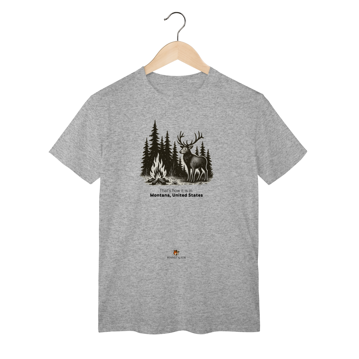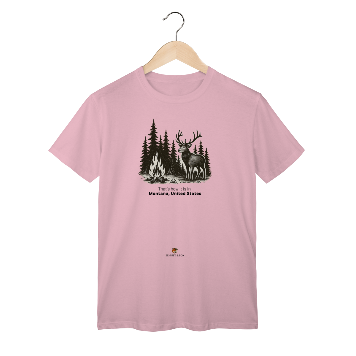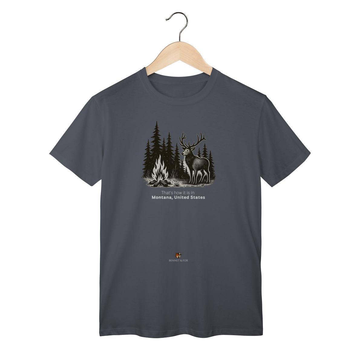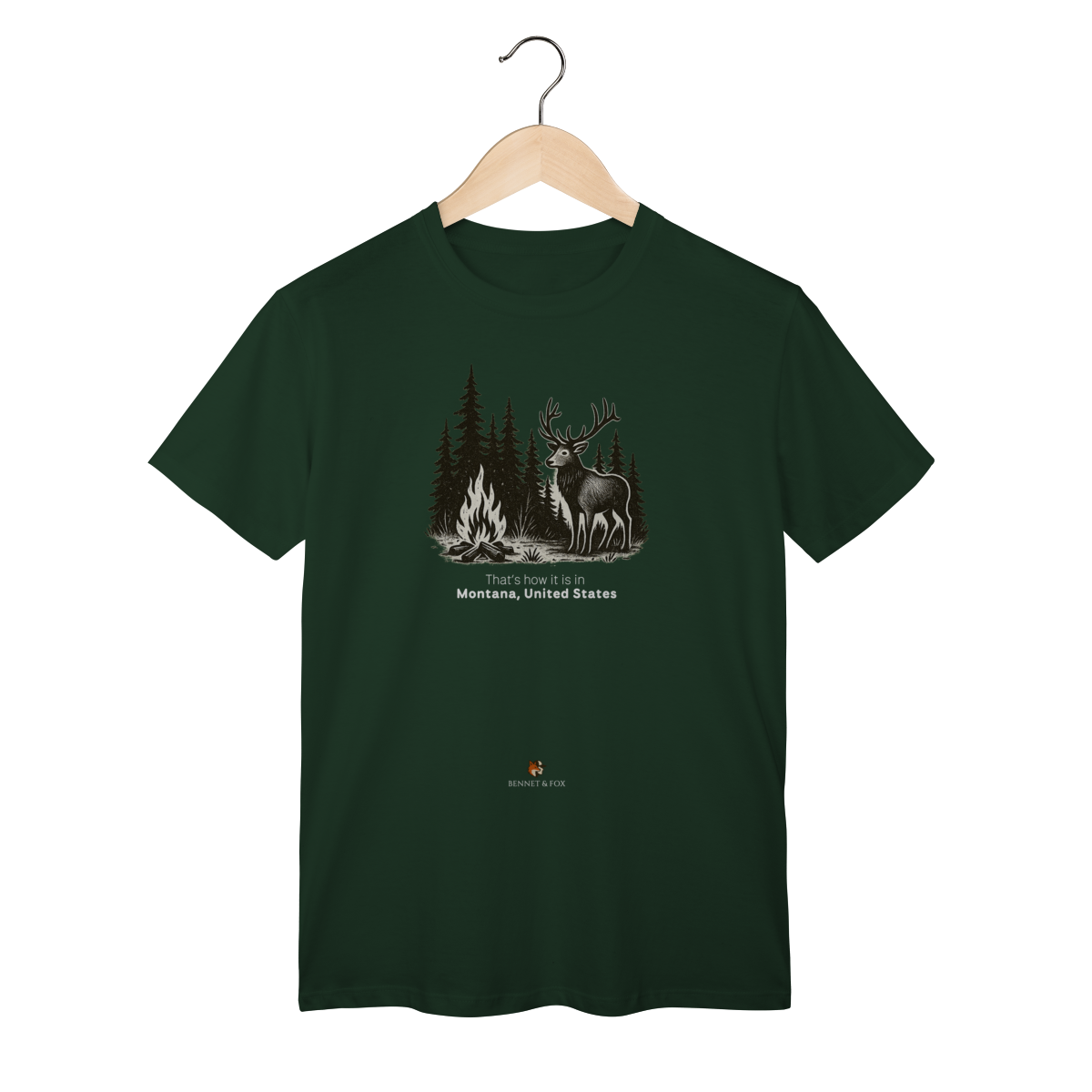 A estampa retrata uma cena clássica de Montana: um majestoso alce se aproxima de uma fogueira sob o céu estrelado, com a frase "That's how it is in Montana". É a camiseta perfeita para quem ama a cultura americana, a vida ao ar livre e a beleza dos pinheiros e da natureza selvagem.