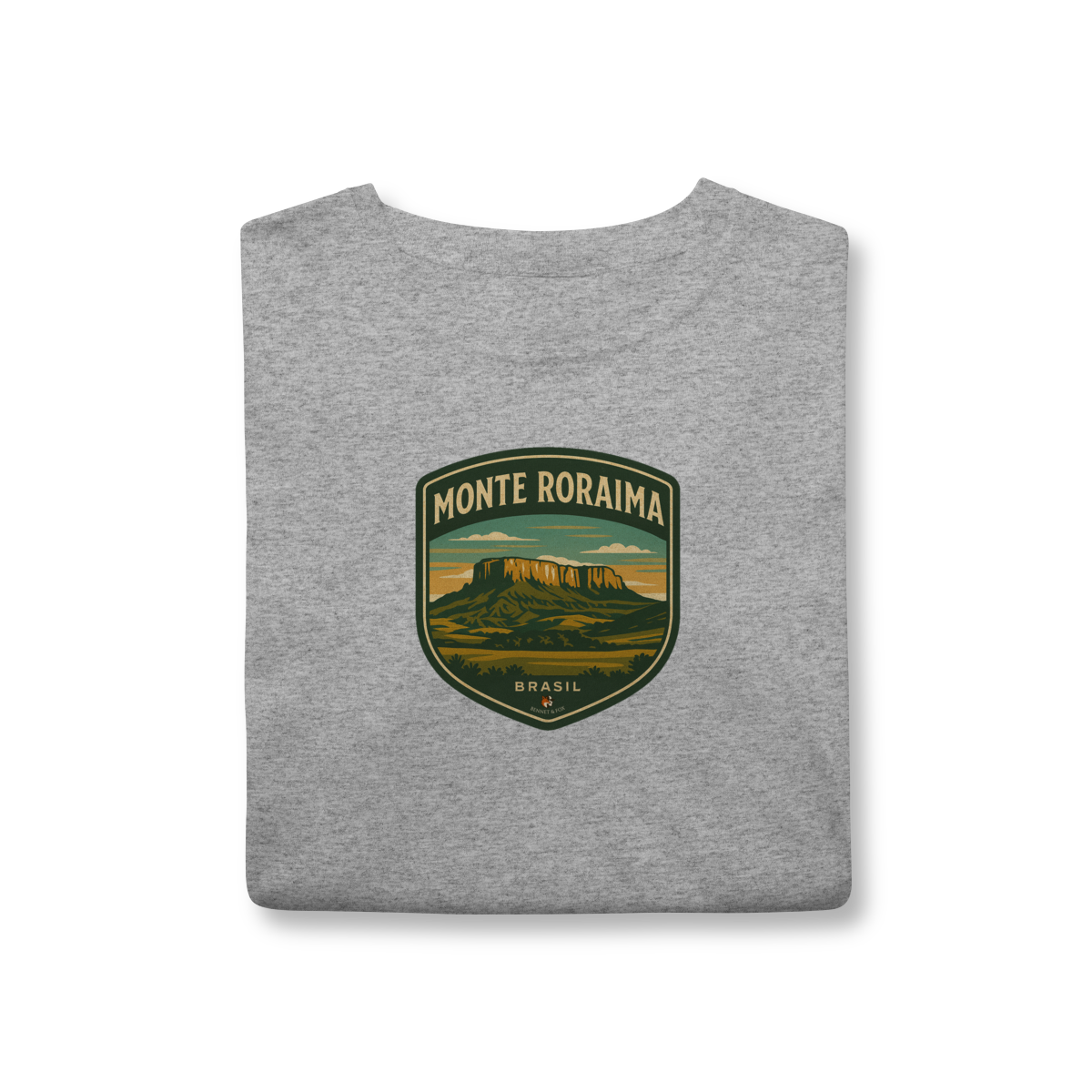 O Monte Roraima não é uma montanha, é outro mundo. Um imenso platô de arenito que se ergue sobre as nuvens, conectando três nações. É o cenário real que parece ficção. Nossa estampa, no estilo de um brasão de explorador, foi criada para honrar essa jornada: a travessia de 8 dias, as formações rochosas únicas do Vale dos Cristais e a sensação de estar no topo do tempo.